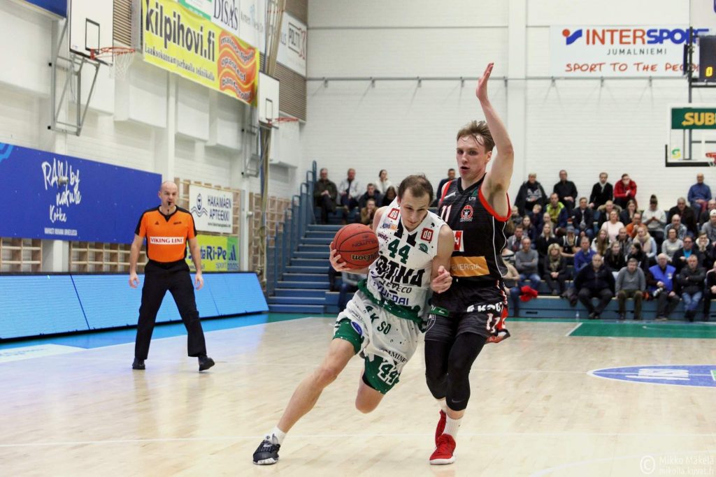 KUVA: Joonas Lehtoranta (44) pelasi hyvän ottelun perjantai-iltana Viron Rakveressä. Kuva on viime talven KTP-Basket – Kouvot -pelistä. Lehtorannan kupeessa on kiinni Kouvojen Severi Kaukiainen.